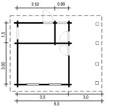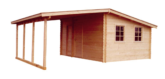 záhradná chatka zrubovej konštrukcia s tromi miestnosťami a integrovaným garážovým státím